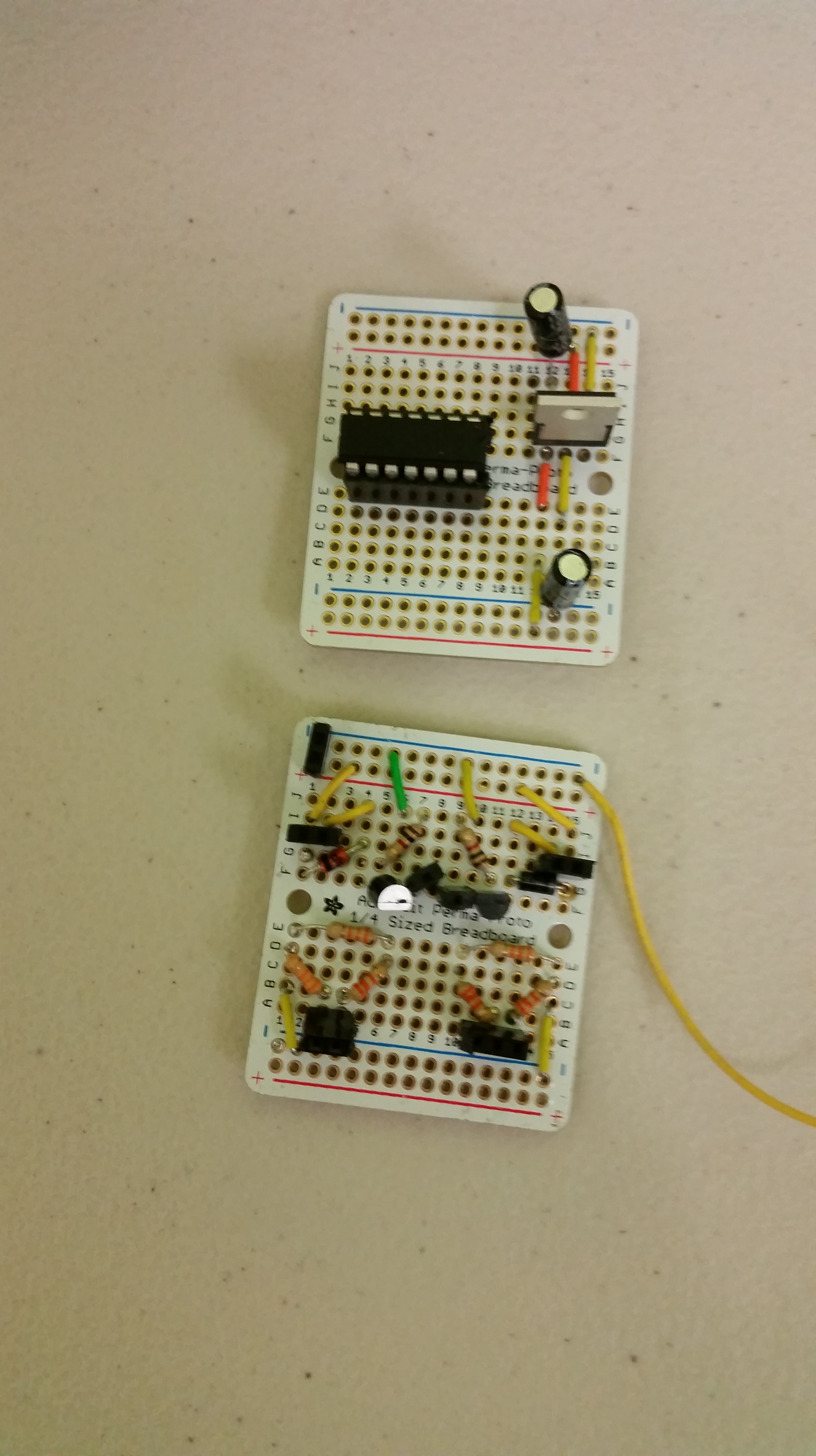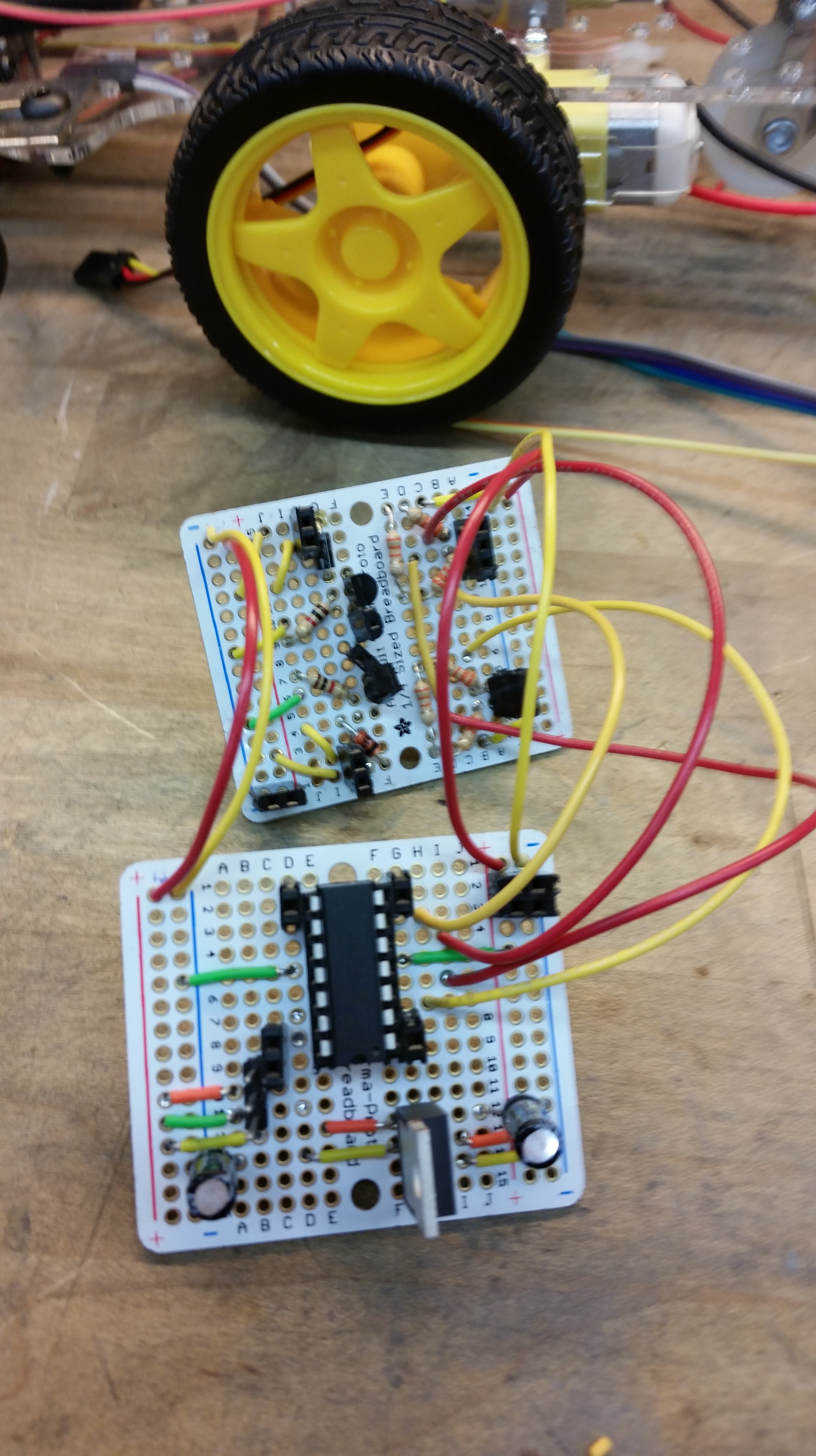 An autonomous robot with a gripper made for the 2015 Vecna Robot Race. This robot used the controller circuits created for the Bouncing Robot with several new additions and modifications. The robot was actuated using two geared DC motors for the wheels and a servo for the gripper. Two infrared proximity sensors and two flex sensors were used to control the robot’s position, another IR sensor was used to activate the gripper if the cup was within it’s range.